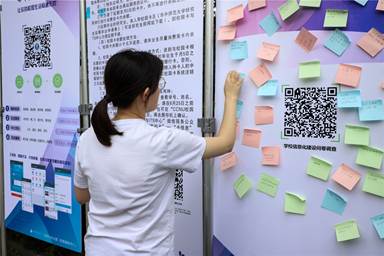 学生参与“你我携手共建智慧校园”的建言献策贴签活动