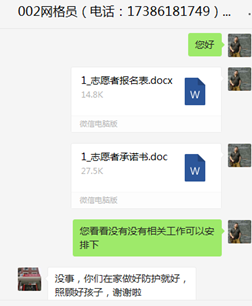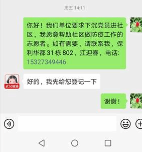 其他小组同志也都积极与所在社区进行了联系,希望可以参与到社区活动中,为抗击疫情维护稳定贡献一份力,史永银和谢雨停还参与学校红外体温检测仪与校大门门禁系统项目工作。附加:陈娟同志的老公参加了他们单位的疫情志愿者团队,廖莉莉的老公也参加了我们学校志愿者团队工作。下图是大家积极报名的截图: