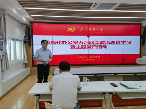 2023年5月19日,信息化办公室党支部在田家炳楼八楼指挥大厅举行五月职工政治理论学习暨主题党日活动,全体在职党员参加,会议由组织委员宁敏同志主持。本次会议分为四个部分:一、学习习近平总书记在学习贯彻习近平新时代中国特色社会主义思想主题教育工作会议上的重要讲话。二、学习《习近平关于调查研究论述摘编》。三、观看《人民情怀》专题纪录片。四、支部书记作讲党课系列专题报告。