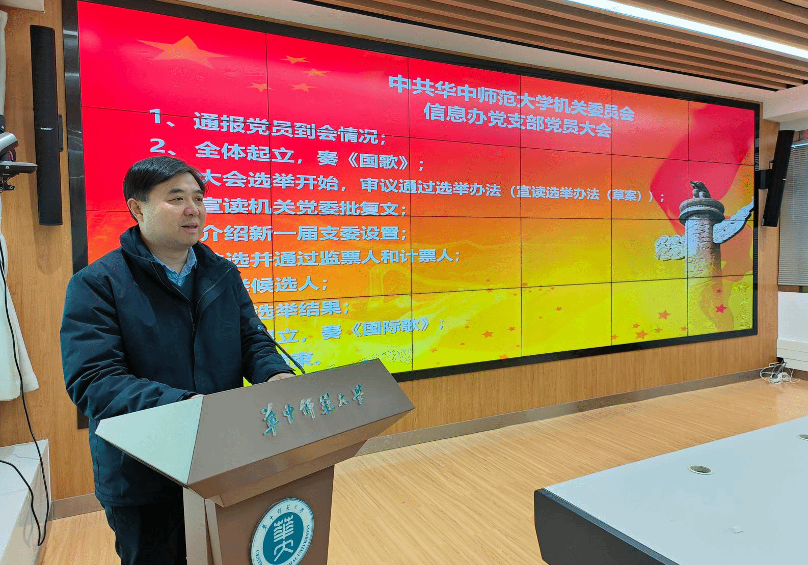 大会第一项由支部书记吴绍靖同志主持。先通报了党员到会情况;接着全体起立,奏《国歌》;