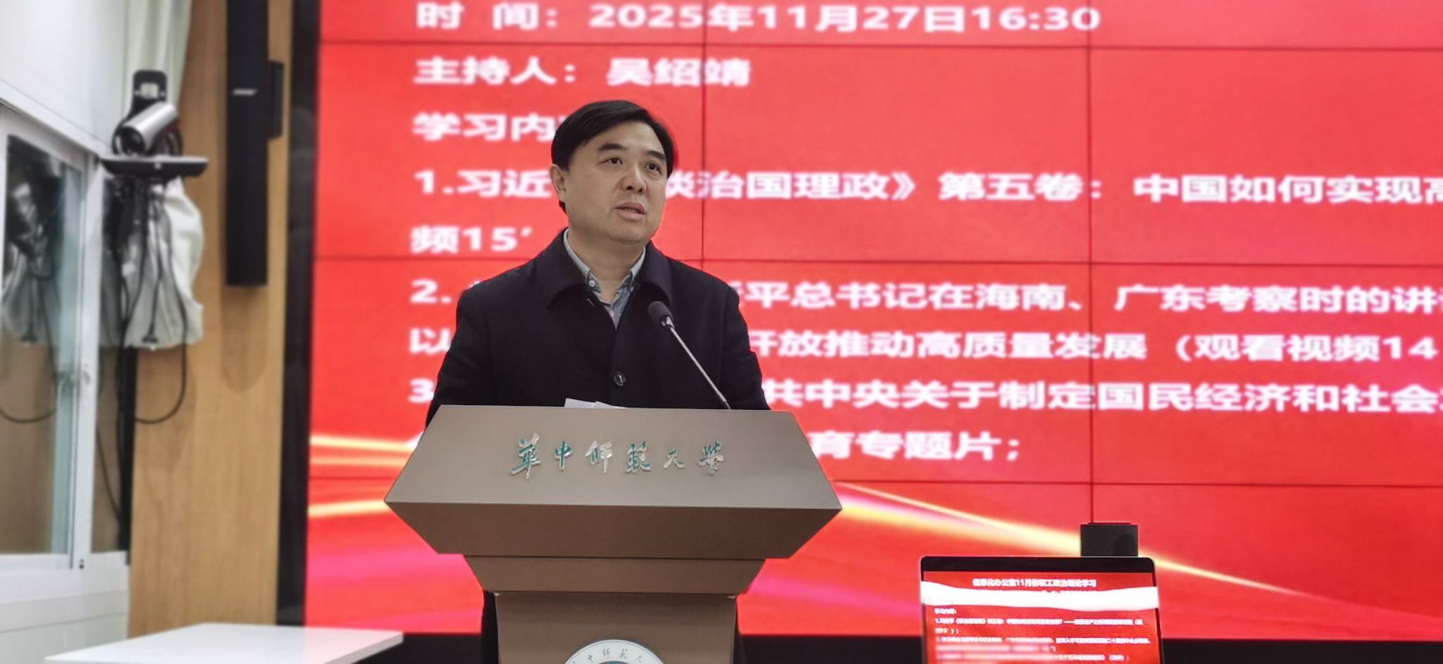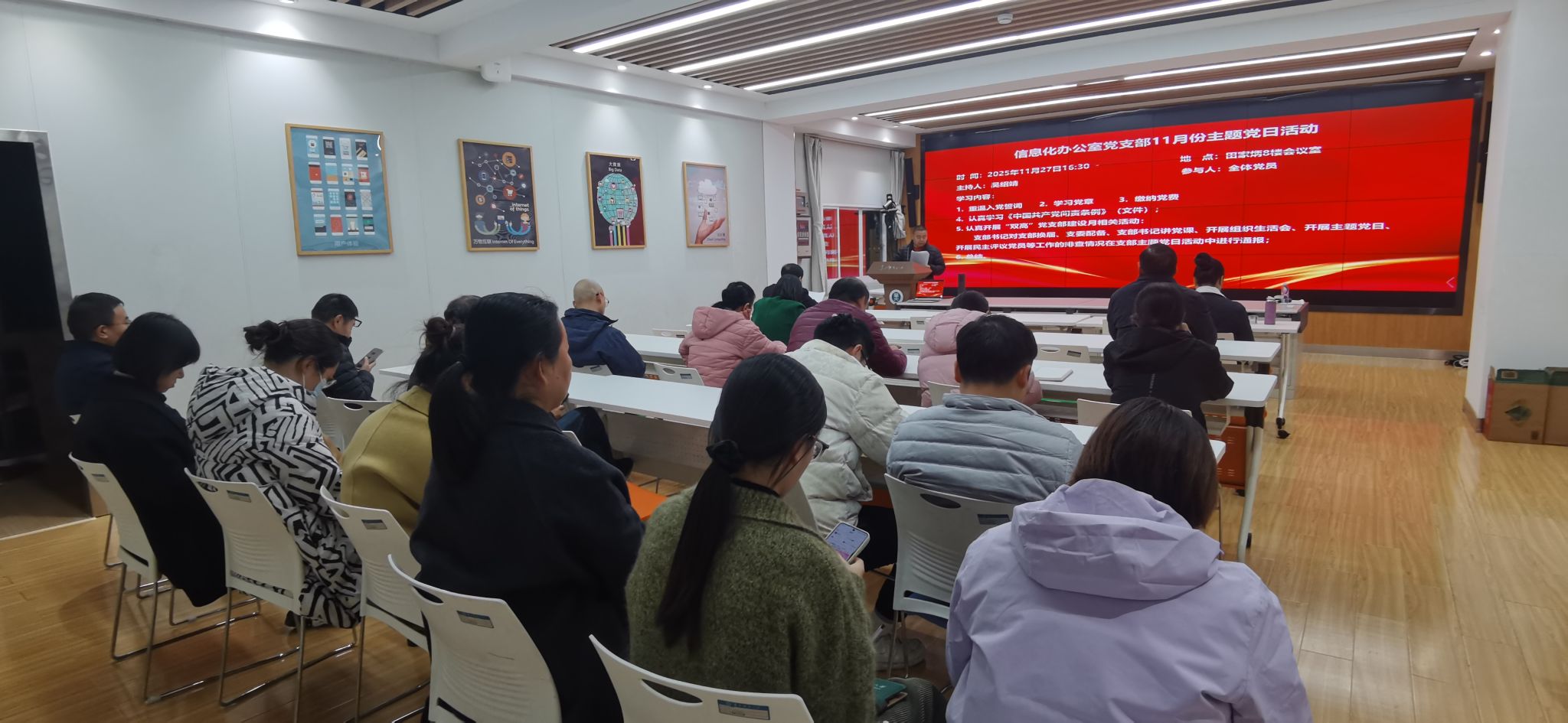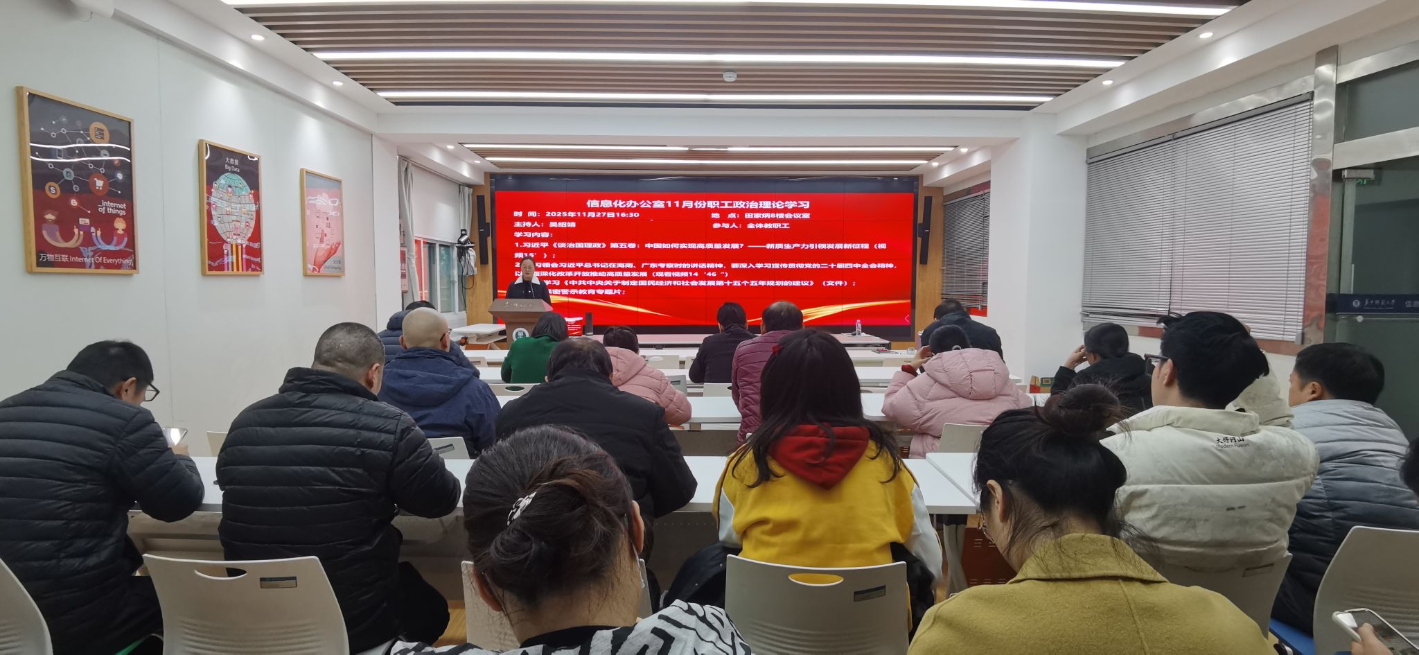 2025年11月27日下午,信息化办公室于田家炳八楼指挥大厅开展专题学习活动。本次活动由吴绍靖同志主持,严格遵循 “政治理论学习+支部主题党日” 双阶段部署,议程紧凑有序、内容充实深刻,切实推动理论学习走深走实、入脑入心。