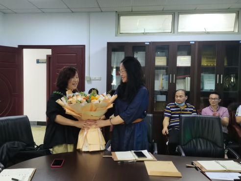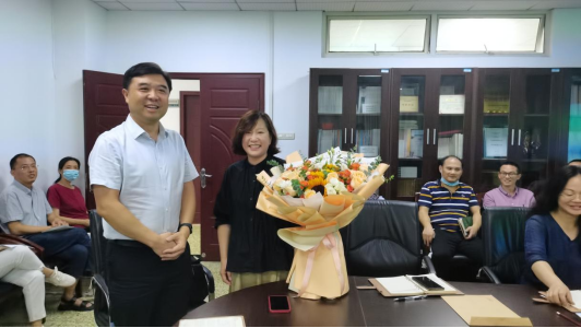 学习完毕,会议进行到最后一个阶段,即举行离退职工陈诗群的欢送仪式。首先,吴绍靖主任感谢陈老师20余年对单位的付出,肯定了陈老师在岗期间对工作的付出,大力赞扬了她兢兢业业、不辞辛劳的爱岗精神,并号召全体教职工向陈老师学习。接着,陈诗群老师谈了自己对工作、未来的感言和畅想,希望在岗同事们未来继续努力,保持旺盛的斗志和激情,做好各项工作,把我办建设得更好。最后,谭冬霞副主任代表单位向陈诗群老师赠送鲜花,吴绍靖主任向陈诗群赠送退休纪念慰问品。