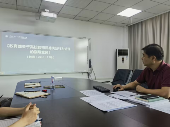 第二阶段是集中学习,主要分为师德师风集中学习教育、意识形态集中学习教育、党员教育三部分内容。吴绍靖主任首先带领大家学习了《教育部关于高校教师师德失范行为处理的指导意见》的十条指导意见。他在学习中指出,师德师风评价教师素质能力的第一标准,我们要对教职工师德师风集中教育学习常抓不懈,以进一步规范高校教师履职履责行为,落实立德树人根本任务,弘扬新时代高校教师道德风尚,努力建设有理想信念、有道德情操、有扎实学识、有仁爱之心的高素质队伍。之后吴主任通报了信息化办公室2023年上半年意识形态工作专项自查情况,并反复强调了意识形态教育的重要性。他指出意识形态教育是单位教职工思政政治理论学习的首要任务,我们要加强每一位职工的意识形态教育,筑牢思想防线,后续单位将进一步加强意识形态教育。最后,谭冬霞副主任带领大家学习了主题教育相关文件精神。