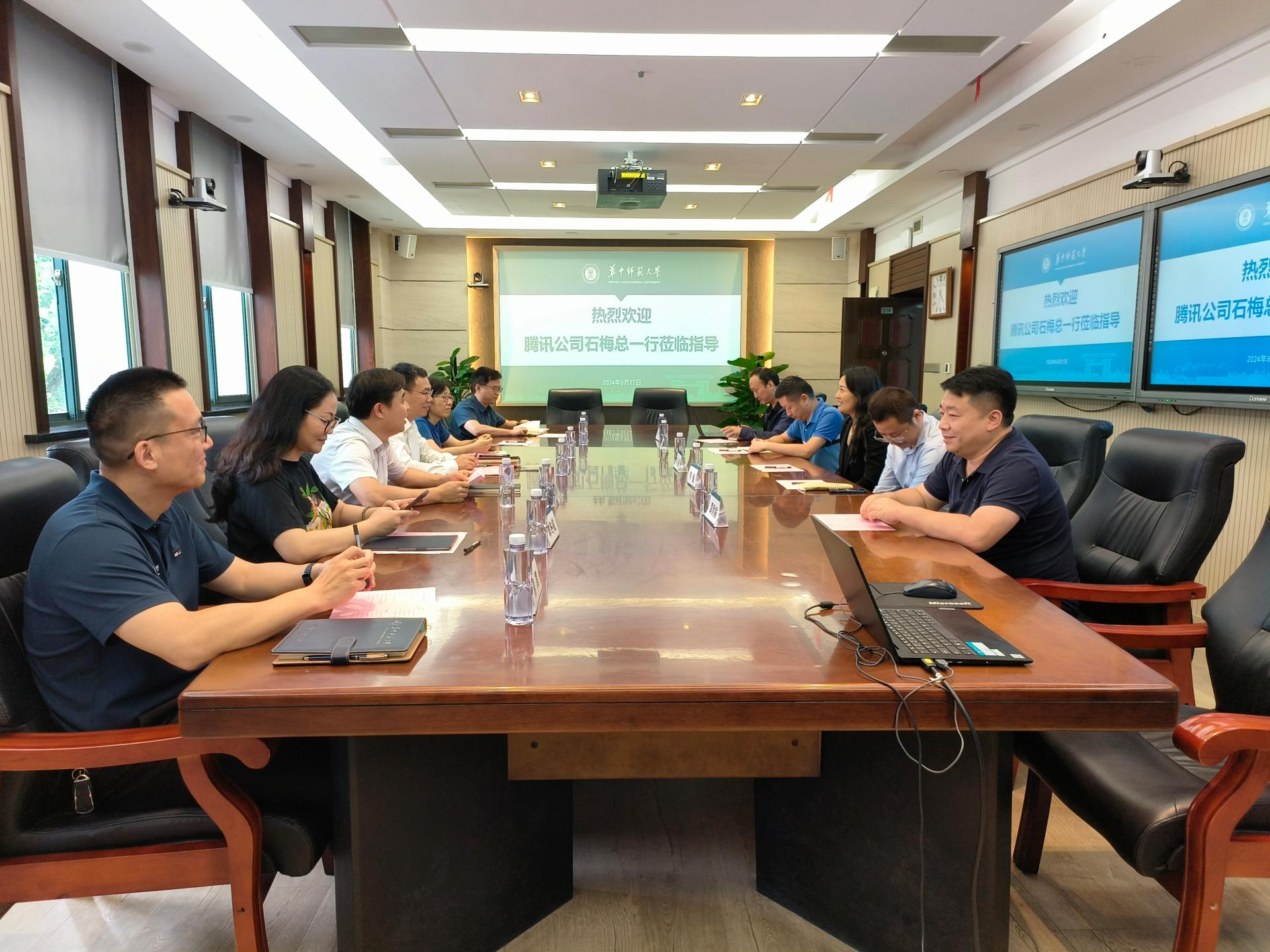6月27日下午,腾讯云副总裁、腾讯教育负责人石梅等一行六人来访我校座谈交流。座谈会在行政楼三楼会议室举行,由信息化办公室主任吴绍靖主持。李鸿飞副校长出席会议。人工智能教育学部教授何秀玲、本科生院副院长卢新元、信息化办公室副主任谭冬霞等七人参加座谈。