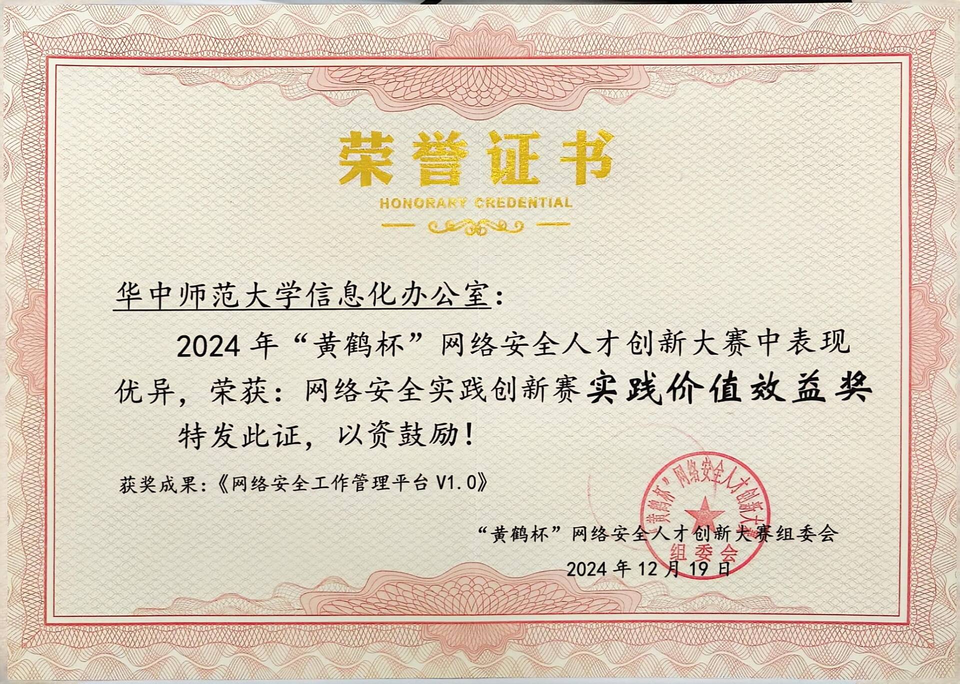 12月19日,2024年“黄鹤杯”网络安全人才创新大赛决赛及闭幕颁奖仪式在国家网络安全人才与创新基地举行。本次比赛设置了实践成果和理论成果两个赛道,共吸引了来自全国的57家单位参加,包括小米科技、神州绿盟、安恒信息、中国电信、天融信、武汉大学、华中科技大学和华中师范大学等名企名校。经过激烈角逐,华中师范大学信息化办公室报送的《网络安全工作管理平台v1.0》荣获本次大赛单项大奖“实践价值效益奖”。