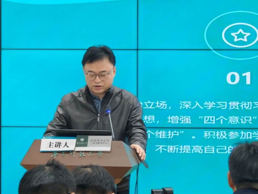 大会第一阶段领导班子和领导干部述职述廉环节中,信息化办公室主任吴绍靖代表领导班子作述职汇报。吴绍靖对2024年信息化办公室领导班子的工作从政治素养与理论学习、从严治党和党风廉政建设、工作业绩和主要成效四个方面进行了总结,全方位展示单位在2024年度取得的成绩,并表示新的一年将再接再厉,主动谋划学校教育数字化转型工作,积极对标学校教育数字化转型行动计划,深度对接2025年世界数字教育大会,充分展示学校数字教育新成果,为学校事业高质量发展作出新的更大的贡献。