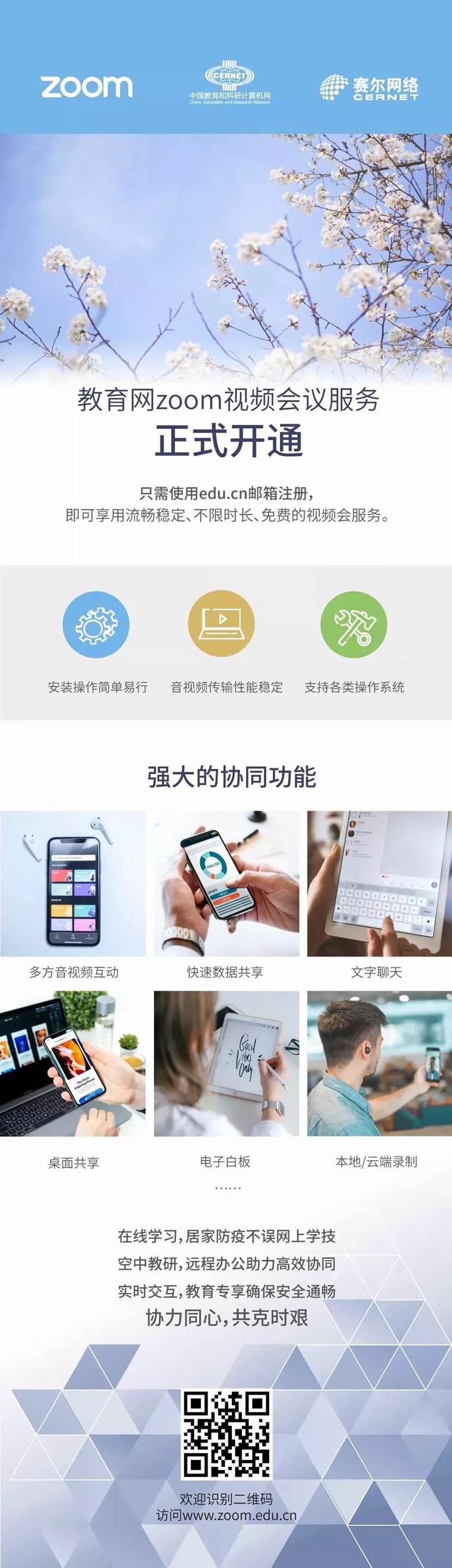 为满足特殊时期校校师生在线教学、科研合作、协同办公等需求,保障师生在抗击疫情期间“停课不停教,停课不停学”,信息化办公室除推出企业微信视频系统外,又联合中国教育和科研计算机网CERNET与国际知名视频会议服务商ZOOM开展合作推出的支撑高校在线教学科研的大规模视频会议服务平台(zoom.edu.cn),经测试和优化,该服务可以广泛适用于Windows、Mac、Linux、iOS、Android系统,操作方便,老师可通过手机、平板电脑、PC等设备轻松使用教育网zoom视频会议系统实现线上工作协同、远程直播教学实时交流、数据信息(office和PDF文档、应用程序、音视频文件、桌面等)同步共享,会议录制、文字聊天,快速邀请、分组讨论、会议等候室等功能,教育网zoom视频会议可以提供流畅、无卡顿的视频沟通体验,现推荐给我校广大师生体验使用,协助大家在疫情期间在科研教学、教学、行政管理等可随时随地、高效有序进行。