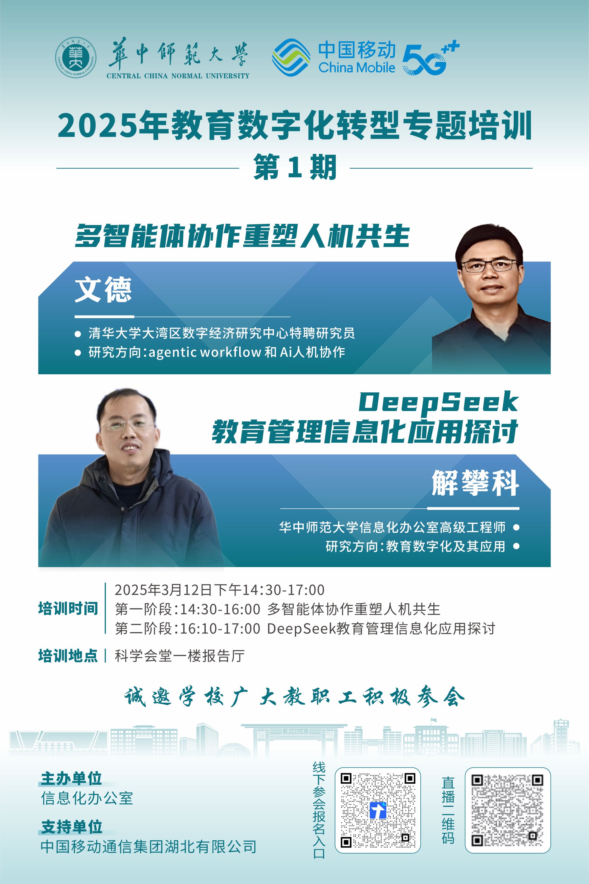 为深入贯彻落实国家教育数字化战略部署,推进学校教育数字化转型专项行动计划,进一步提升学校管理人员以及专任教师的AI素养,探索AI技术在学校教、学、管、研、服等方面的创新应用,定于2025年3月12日举办学校2025年第1期教育数字化转型专题培训。现将有关事项通知如下: