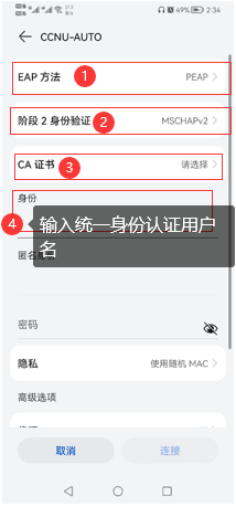 安卓系统:则按以下方法设置:点击“CCNU-AUTO”无线信号,“EAP方法”选择“PEAP”,“阶段2身份验证”选择“MSCHAPv2”,“CA证书”选择“无”,“身份”输入用户名,“密码”输入密码,然后点击“连接”。