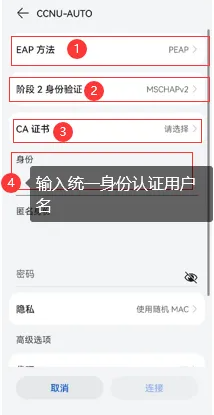 1).安卓系统连接“CCNU-AUTO”的设置改为如下:
