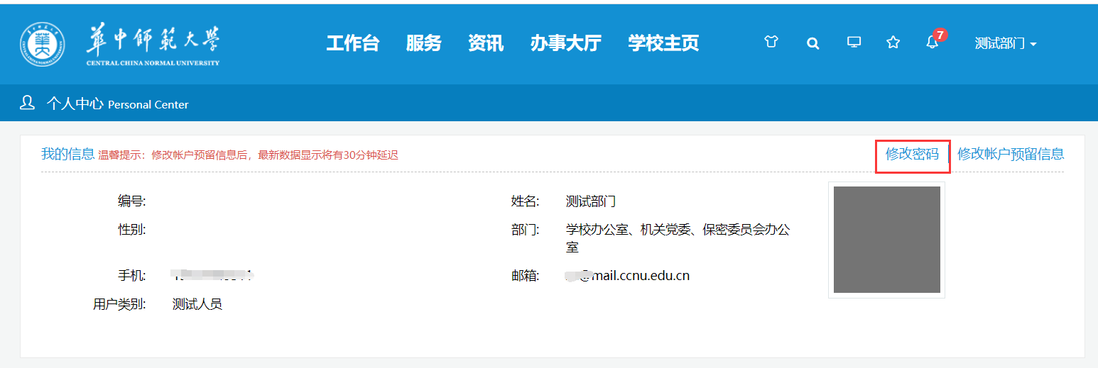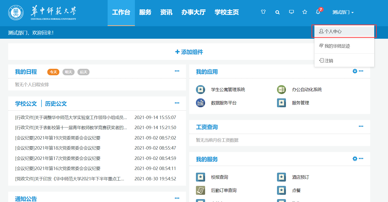 (1)登录信息门户,one.ccnu.edu.cn,点击右上角“个人中心”