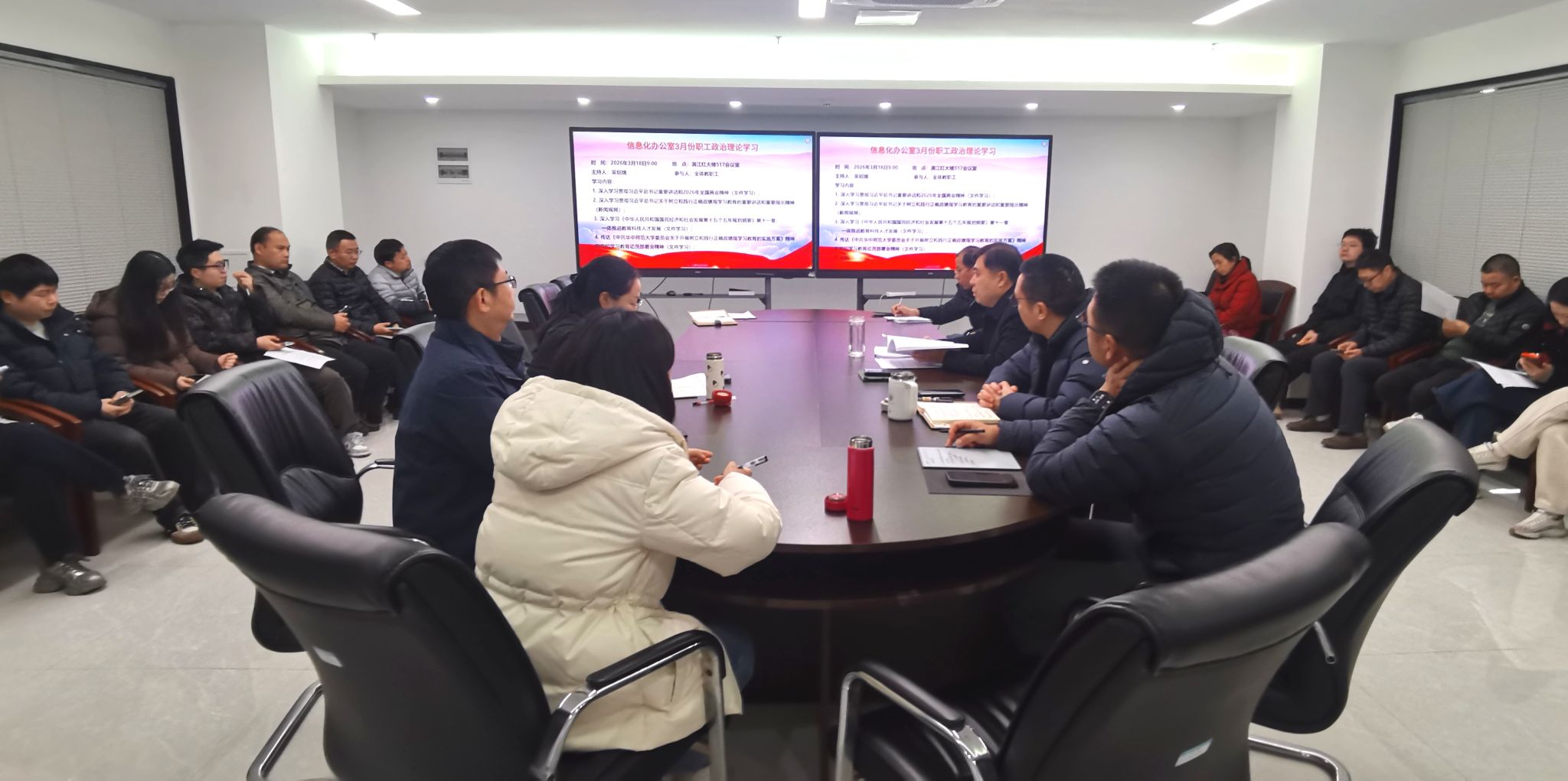 2026年3月18日上午,信息化办公室在满江红大楼517会议室开展3月职工政治理论学习暨支部主题党日活动,全体党员及职工参会,会议由吴绍靖主持。