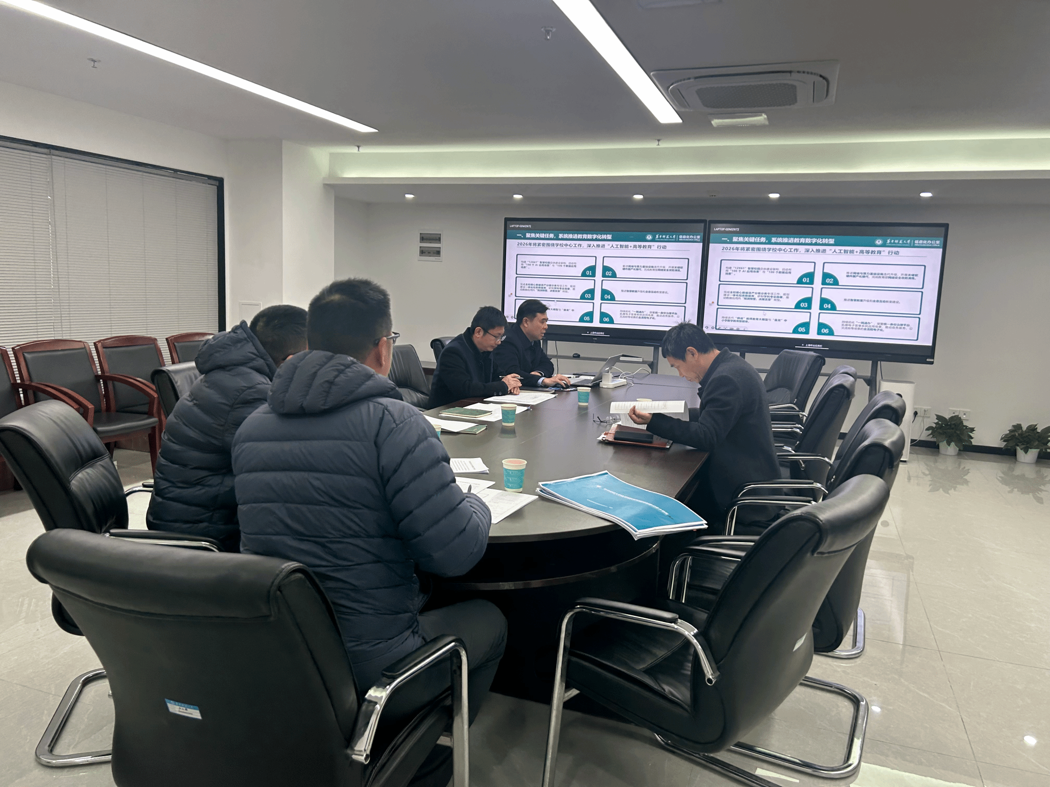 李鸿飞副校长作总结讲话,对信息化办公室前期工作成效给予充分肯定,并就做好2026年数字化转型工作提出三点要求:一是紧扣战略主线,紧紧围绕“人工智能+教育”发展“十五五”规划要求,找准工作切入点,确保方向不偏、焦点不散;二是坚持前瞻谋划,强化工作前置意识,提前布局、系统谋划,统筹推进各项重点任务落地见效;三是筑牢廉政防线,健全廉政防护体系,强化廉洁自律意识,强化内控建设,确保数字化转型工作在规范有序、高效安全的轨道上运行。