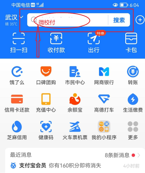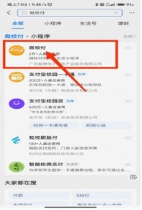 第一步:打开支付宝APP,在首页第一行中搜索小程序“微校付”。